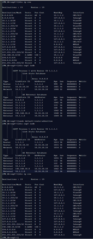 需要在防火墙ospf进程下配置default-route-advertise,普通区域通告默认路由。问题解决