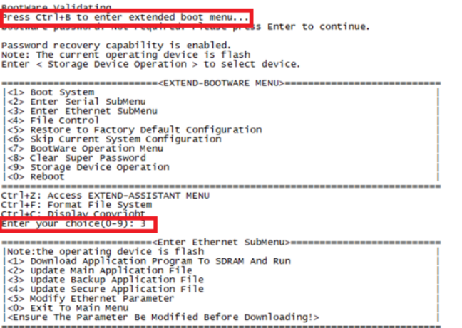 #在设备启动过程中,当命令行界面出现“Press Ctrl+B to enter extended boot menu...”时,电脑立即键入<Ctrl+B>,按下<Enter>键后,系统将进入BootWare主菜单在BootWare主菜单下键入<3>,可以进入以太网口子菜单,系统显示如下:。