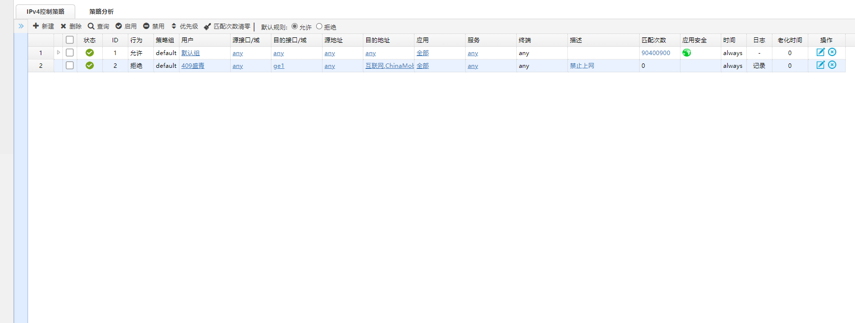 还有,现在正常第一条是any全放通的的 第二条是拒绝的某用户的 能匹配到第二条吗 匹配策略是什么样的机制? 如果更改了拒绝某用户上网策略的位置,用户误操作把用户都去掉了之后会变成动作拒绝-any 是不是就出问题了。