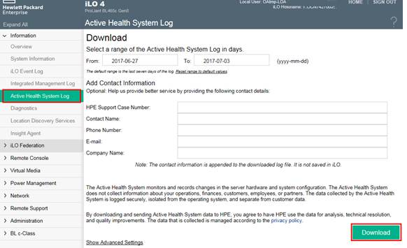 大概应该在这附近。在iLO 的Web Administration 界面,点击Information 下的Active Health System Log 后,点击右下的Download 按钮,下载扩展名为AHS 的报告。