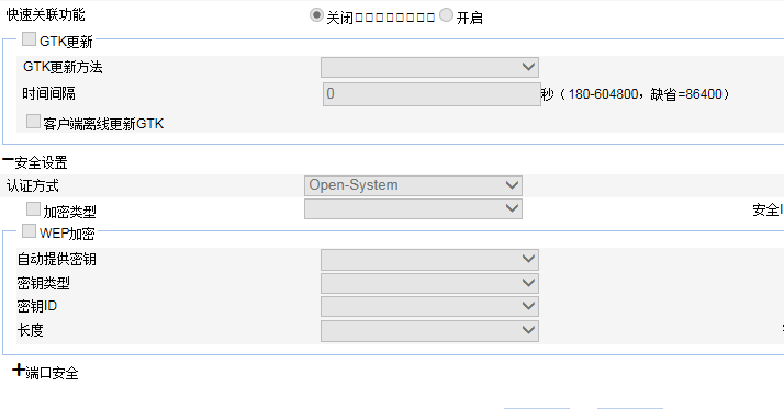 快速关联一般不用开,下面加密那些,是因为你建无线的时候选的是clear不加密,所以加密配不了