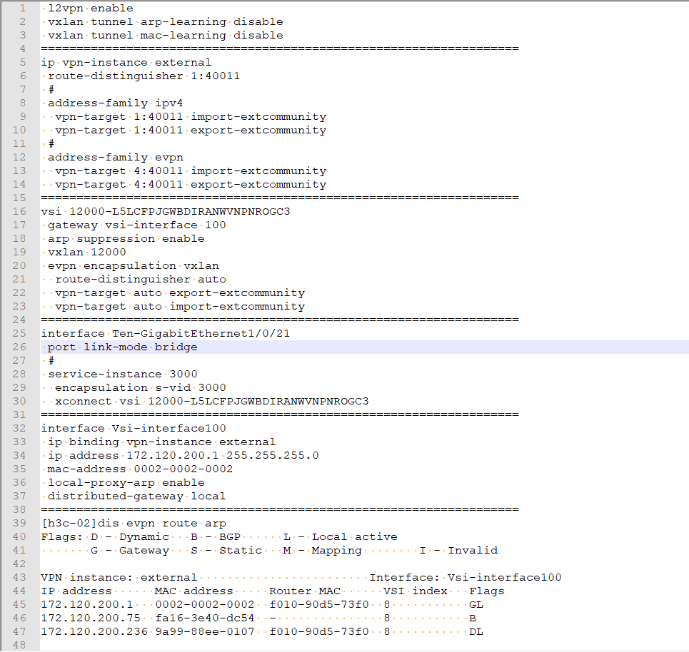 l2vpn enable vxlan tunnel arp-learning disable vxlan tunnel mac-learning disable =================================================================== ip vpn-instance external route-distinguisher 1:40011 # address-family ipv4 vpn-target 1:40011 import-extcommunity vpn-target 1:40011 export-extcommunity # address-family evpn vpn-target 4:40011 import-extcommunity vpn-target 4:40011 export-extcommunity =================================================================== vsi 12000-L5LCFPJGWBDIRANWVNPNROGC3 gateway vsi-interface 100 arp suppression enable vxlan 12000 evpn encapsulation vxlan route-distinguisher auto vpn-target auto export-extcommunity vpn-target auto import-extcommunity =================================================================== interface Ten-GigabitEthernet1/0/21 port link-mode bridge # service-instance 3000 encapsulation s-vid 3000 xconnect vsi 12000-L5LCFPJGWBDIRANWVNPNROGC3 =================================================================== interface Vsi-interface100 ip binding vpn-instance external ip address 172.120.200.1 255.255.255.0 mac-address 0002-0002-0002 local-proxy-arp enable distributed-gateway local =================================================================== [h3c-02]dis evpn route arp Flags: D - Dynamic B - BGP L - Local active G - Gateway S - Static M - Mapping I - Invalid VPN instance: external Interface: Vsi-interface100 IP address MAC address Router MAC VSI index Flags 172.120.200.1 0002-0002-0002 f010-90d5-73f0 8 GL 172.120.200.75 fa16-3e40-dc54 - 8 B 172.120.200.236 9a99-88ee-0107 f010-90d5-73f0 8 DL