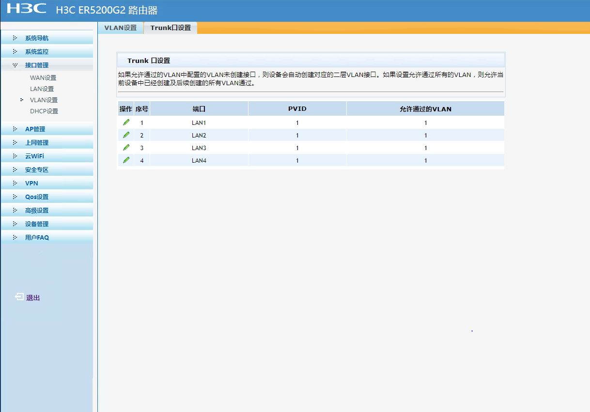 单击 【接口管理】--【Trunk口设置】,把和交换机互联接口划到不同的vlan中,改pvid改成