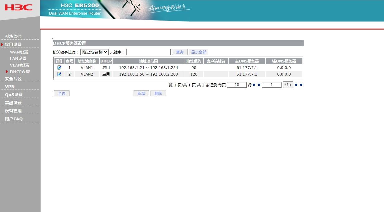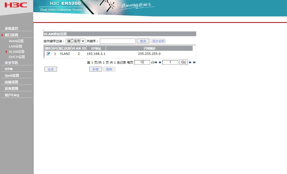 单击 【接口管理】--【VLAN设置】--【新增】 ,在路由器上配置网关。新增一个vlan2,并且给vlan 2配置地址:192.168.2.1 。