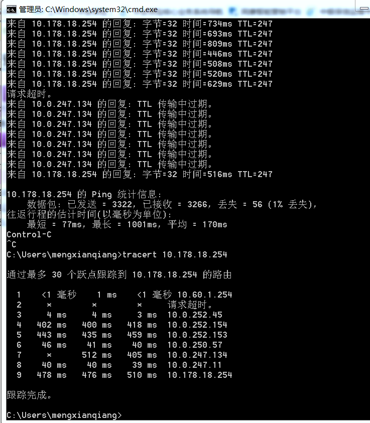 如图,没有发现环路,但是总是ping了一段时间后就提示ttl为0了,过了一会儿就又恢复正常了。
