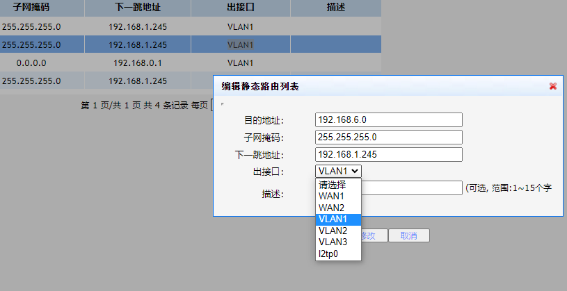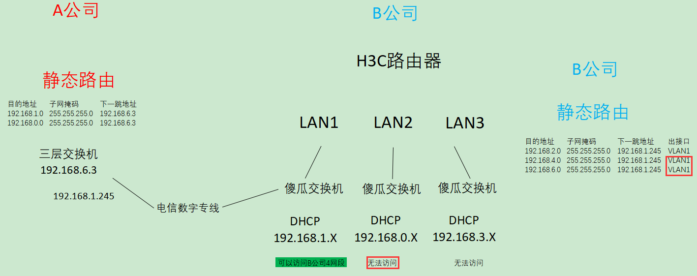 如组网所示, 目前只有LAN1/vlan1下的设备能访问B公司的4网段, 请问是否是出接口只能选择一个的原因导致呢