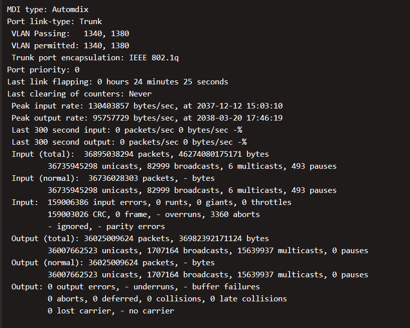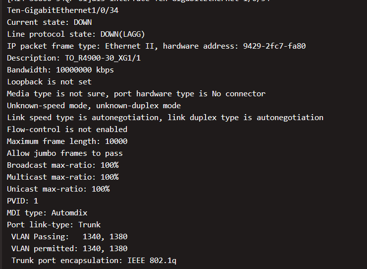 这个crc错包计数也太多了,多次dis看看是不是还在增长中,如果还在增长,那大概率光模块或者连接线有问题,替换测试看看