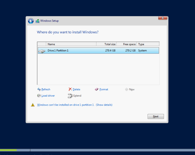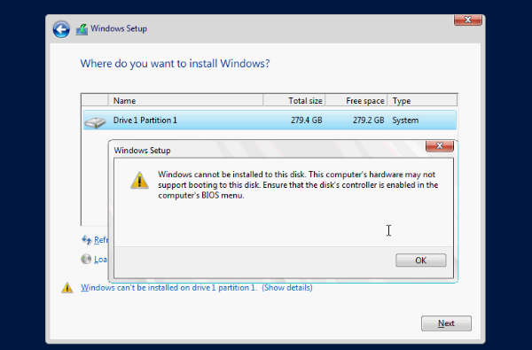 HP DL20 GEN10 安装Windows server 2016过程提示Windows can't be installed on Drive 1 Partition1.该如何解决