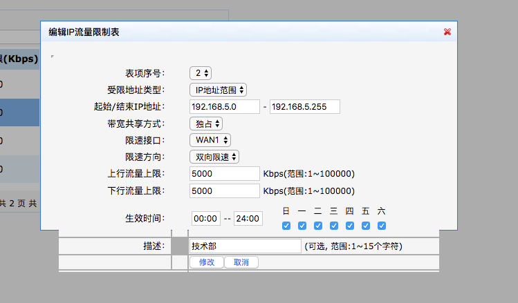 qos章节里,有一个选项,点选每IP通道只能使用预设的带宽,然后设置每个IP可用的带宽,在设置需要对那个IP段限速,就可以了
