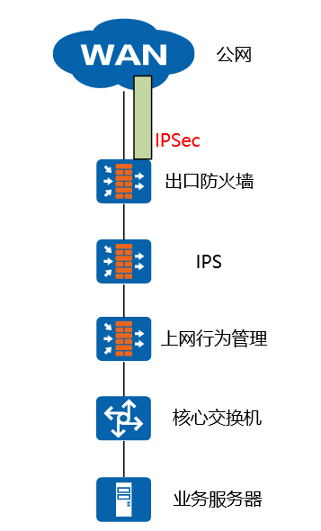 业务访问:内网业务服务器通过在出口防火墙上建立的IPSec隧道访问其他内网服务器。