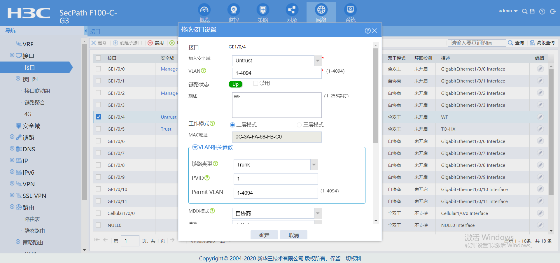 vlan虚接口也要加入安全域