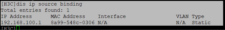 [H3C-GigabitEthernet1/0/1] ip source binding ip-address 192.168.0.1 mac-address 0001-0203-0406