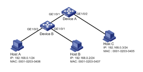 # 配置IPv4静态绑定表项,只允许MAC地址为0001-0203-0405、IP地址为192.168.0.3的Host C发送的IP报文通过端口GigabitEthernet1/0/2。