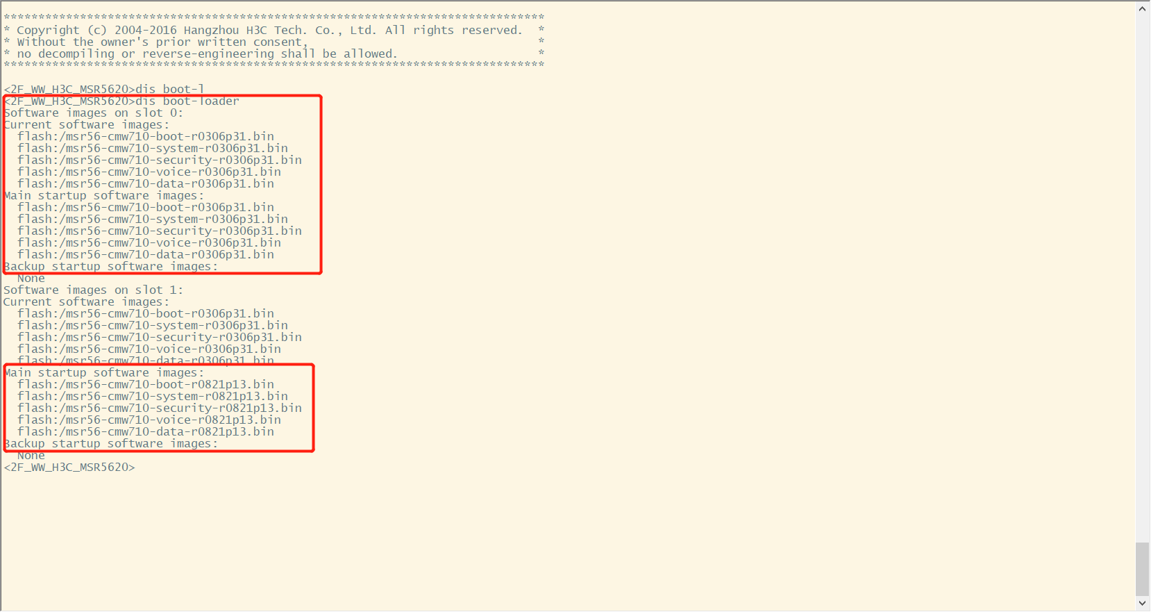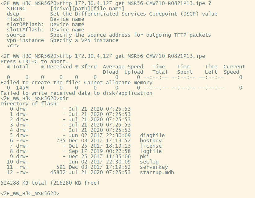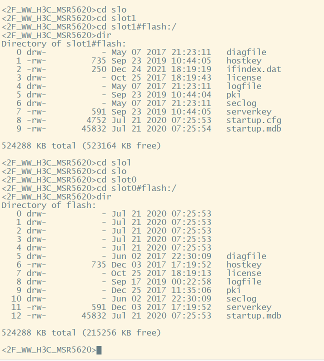 slot1的下的空间却有500MB,把ipe上传到slot1下,使用boot-loader命令将文件作为主用IPE文件后,解压完成后就会断开连接,重新远程进入路由器后,使用命令dis boot-loader 查看