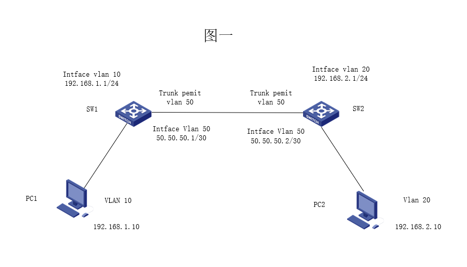 3、如图二,如果交换SW1和SW2间的互联地址不变,vlan号变成vlan 50 和 vlan 60 ,那PC1和PC2间的还能正常通信吗?