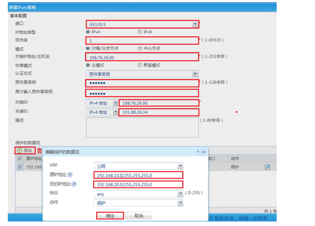 #在“基本配置”中“接口”选择接入外网的1/0/3接口,“优先级”设置为1(优先级代表了策略匹配顺序,当存在多条VPN隧道时需要对各VPN隧道优先级进行设置),“认证方式”选择域共享密钥,建立VPN两端隧道的域共享密钥必须一致。对端ID设置对IP地址即分公司公网地址,本端ID默认为本端公网接口IP地址。在保护的数据流中添加源为总部内网网段192.168.10.0/24,目的IP地址为分部内网网段192.168.20.0/24。