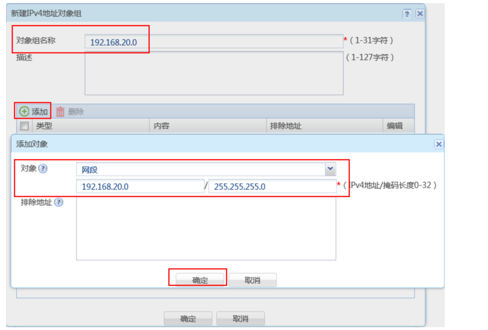#配置对象组名称为“192.168.20.0”,点击“添加”,对象地址为192.168.20.0网段,为分支内网段地址
