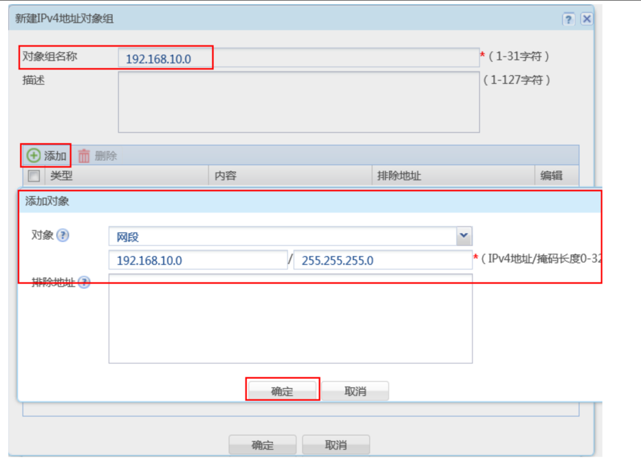 #配置对象组名称为“192.168.10.0”,点击“添加”,对象地址为192.168.10.0网段,为总部内网网段地址