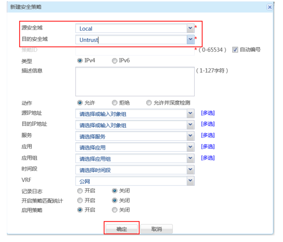 #最后确认一下“源IP地址”为对端内网所在对象组,“目的IP地址”为本端内网地址所在对象组,确定即可