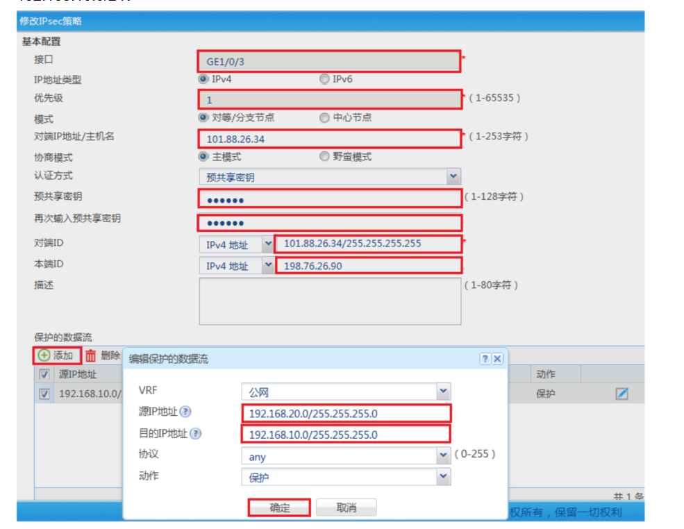 #在“基本配置”中“接口”选择接入外网的1/0/3接口,“优先级”设置为1(优先级代表了策略匹配顺序,当存在多条VPN隧道时需要对各VPN隧道优先级进行设置),“认证方式”选择域共享密钥,建立VPN两端隧道的域共享密钥必须一致。对端ID设置对IP地址即分公司公网地址,本端ID默认为本端公网接口IP地址。在保护的数据流中添加源为分部内网网段192.168.20.0/24,目的IP地址为总部内网网段192.168.10.0/24。