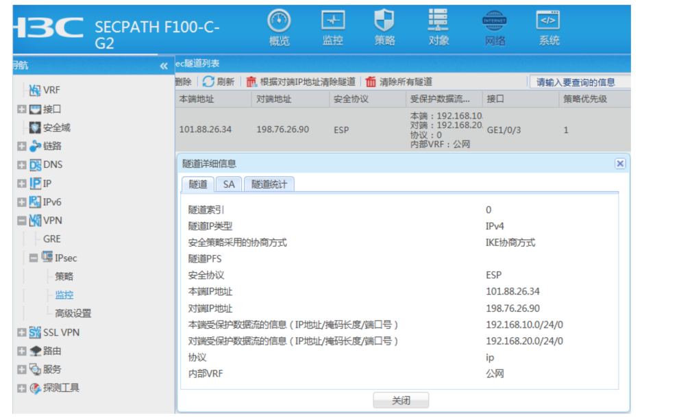 在“网络”>“VPN”>“IPsec”>“监控”中查看对到信息,如果有隧道信息就说明VPN已经正常建立,如果没有隧道信息就说明VPN未建立成功。