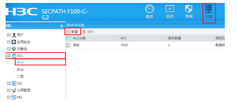 在“对象”>“ACL”>“IPv4”中点击新建按钮。