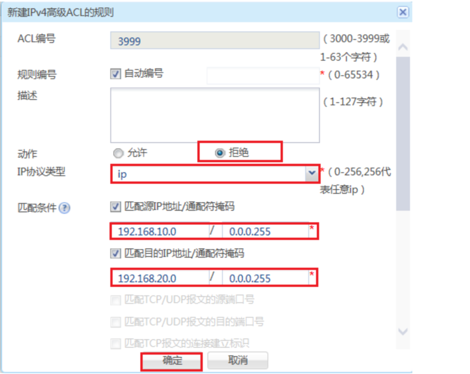 #以总部防火墙为例,动作选择拒绝,IP协议类型选择拒绝,匹配条件匹配总部侧内网到分部侧内网的网段(在分部侧防火墙匹配条件取反)后点击确定添加下一条策略。