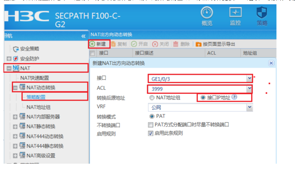 #在“策略”>“NAT”>“NAT动态转换”>“策略配置”中点击新建按钮。接口选择外网接口,ACL选择之前创建的3999,转换后地址选择接口IP地址。