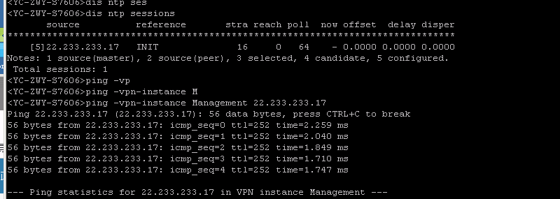 ntp-service unicast-server 22.233.233.17 vpn-instance Mangement