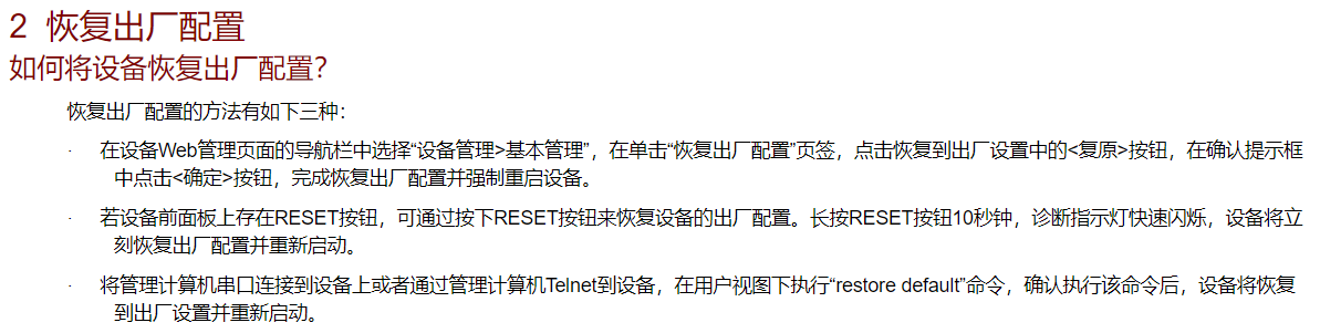 忘记设备Web管理登录密码 | · 单击Web登录界面的“忘记密码?”链接进入页面后下载文件“name_restore.txt”(点击右键,选择“目标另存为”保存该文件到本地,IE8及以下版本先直接点击文件,再点击右键保存文件,name为产品名称,比如ER5200G2),将该文件放入U盘(FAT32格式)根目录,将U盘插入USB接口,设备可恢复缺省登录密码。如果不能正常下载该文件,可手动创建同名文件,在文件第一行顶格输入restore password保存即可(注意:恢复缺省登录密码后会在U盘中将该文件删除) · 通过在串口下输入password命令来设置新的密码。具体方法请参见18.3.1 修改路由器登录密码(ER2200G2不支持此方法) · 通过Reset键进行恢复(在设备通电情况下,用针状物按住Reset键5秒钟左右,直至诊断指示灯慢速闪烁,可恢复设备的缺省登录密码,连接到Web界面,输入缺省用户名和密码进行登录。仅ER2200G2支持此方法) |