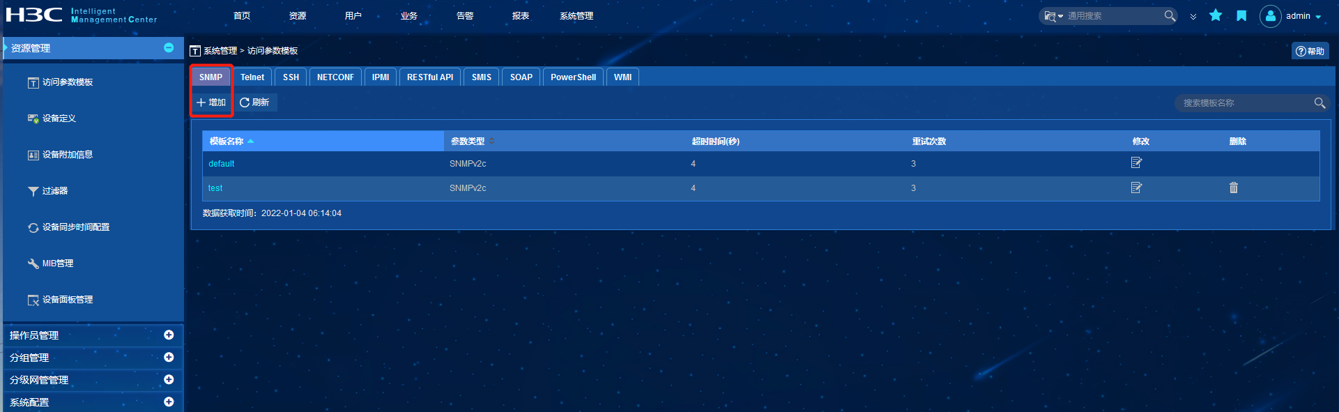 iMC管理页面的“系统管理>资源管理>访问参数模板”中增加或修改已有的SNMP访问参数模板