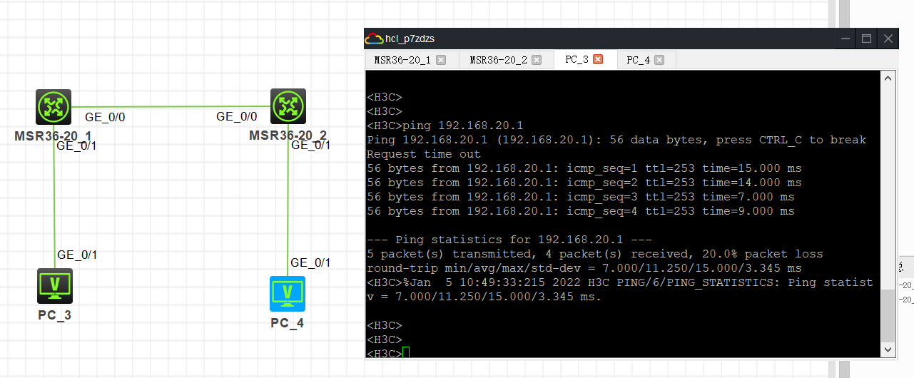 #在MSR V7路由器上带源ping MSR V5路由器内网网关地址