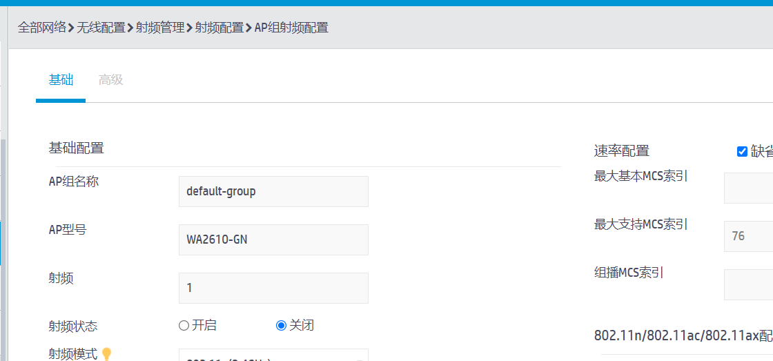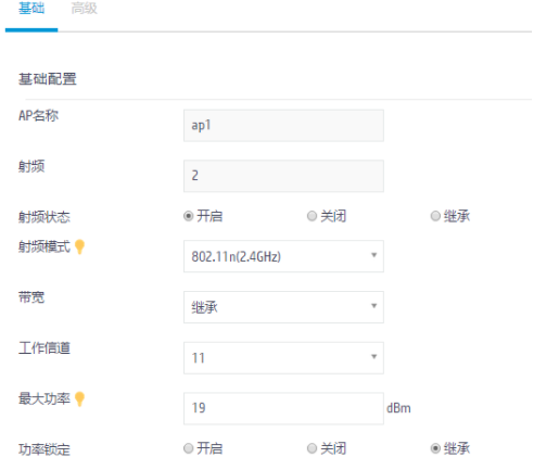 (3) 在“射频配置”页签下,单击“所有AP的射频”一栏右上角的<更多>按钮,选择ap1的2.4GHz(2)射频,点击<编辑>按钮,在“基础”页签中“基础配置”下进行如下配置: