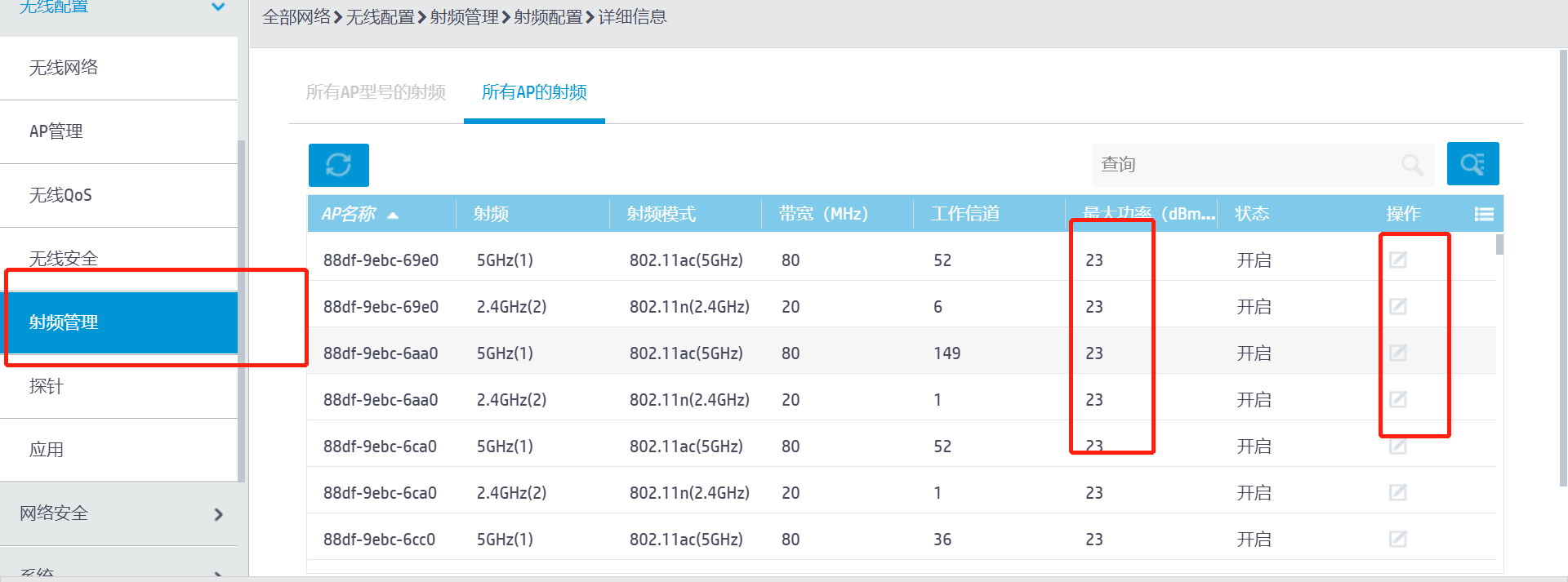 (2) 选择页面左侧导航栏的[无线配置/射频管理],进入射频配置页面。