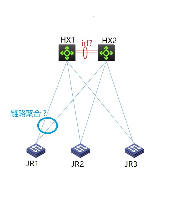 如图,请问HX1和HX2之间红圈连接是不是做IRF?而蓝圈中JR1分别连接HX1和HX2,是做链路聚合吗?我是小白,请高手不吝赐教!