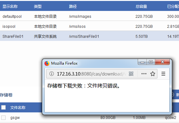 CAS CVM虚拟化管理平台里面,用浏览器下载存储卷的文件到本地进行备份,10G左右大小的文件可以下载,比较大的文件,几十个G和上百G的文件无法下载,一下载就提示存储卷下载失败,文件拷贝错误,换了各种浏览器都没用,求解!