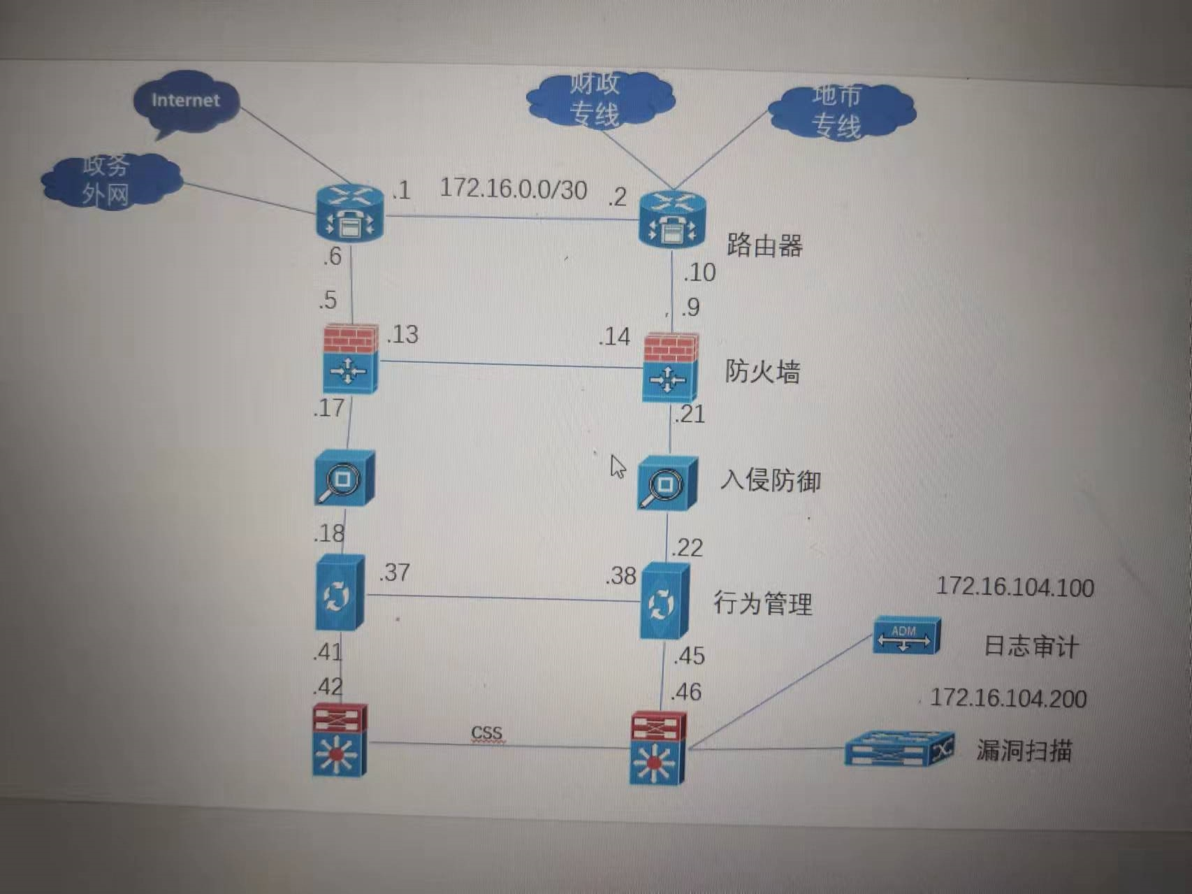 出口是两台路由器,之间是三层互联,起ospf。左边路由器上行接互联网,右边路由器接财政专网;