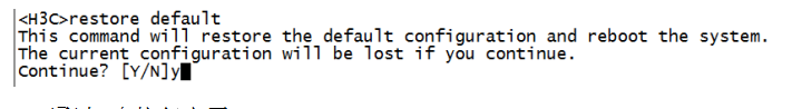 <H3C>提示进入设备命令行,命令行下输入:restore default命令并回车,再次输入Y确认后,路由器将恢复到出厂设置并重新启动,同时账号密码也恢复到初始配置,初始账号密码均为小写的admin。