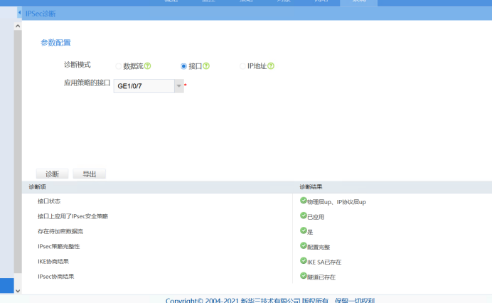 interface GigabitEthernet1/0/7 port link-mode route bandwidth 100000 ip address 公网IP 255.255.255.252 nat outbound 3888 ipsec apply policy shanghai gateway ****