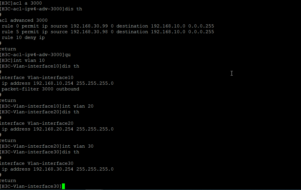 大佬们华三交换机上有三个网段vlan10,vlan20,vlan30,配置如下图,为什么vlan10网段可访问192.168.30.98,192.168.30.99这个ip啊,而且vlan10网段访问不了网关192.168.10.254