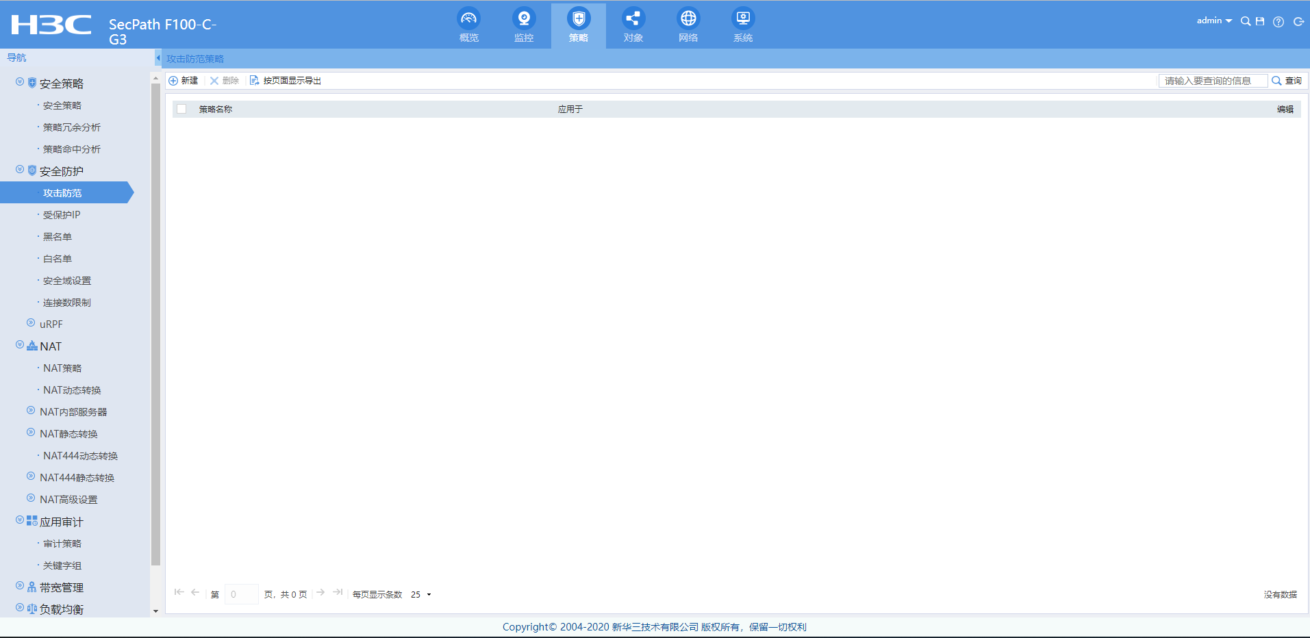 没有做策略。只是用的默认的IPS防攻击吧。是H3C供应商工程师上门安装配置的。