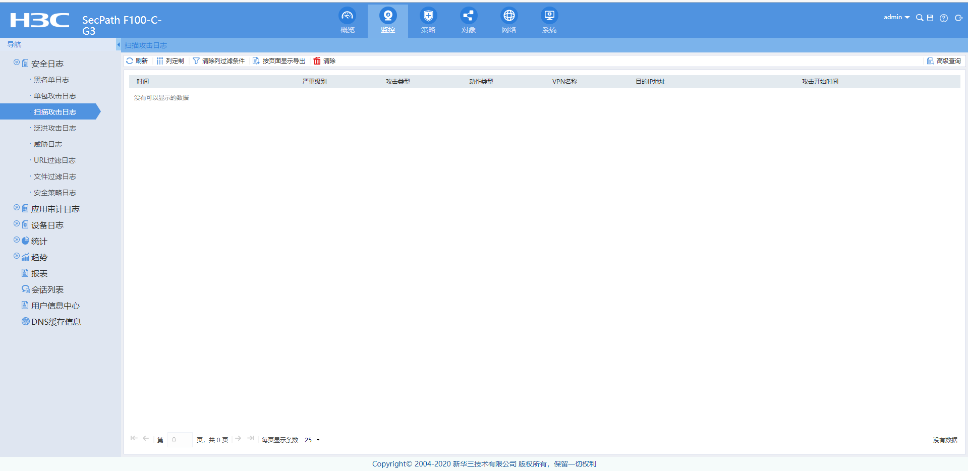 F100-C-G3已配置上线半个月了,进去设备查看安全日志里空空如也,不知道是网络真的很安全没有受到任何外部攻击还是设备配置不对。