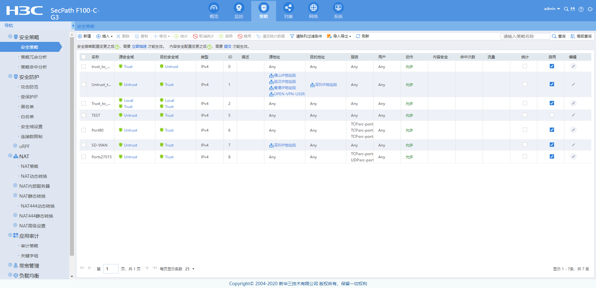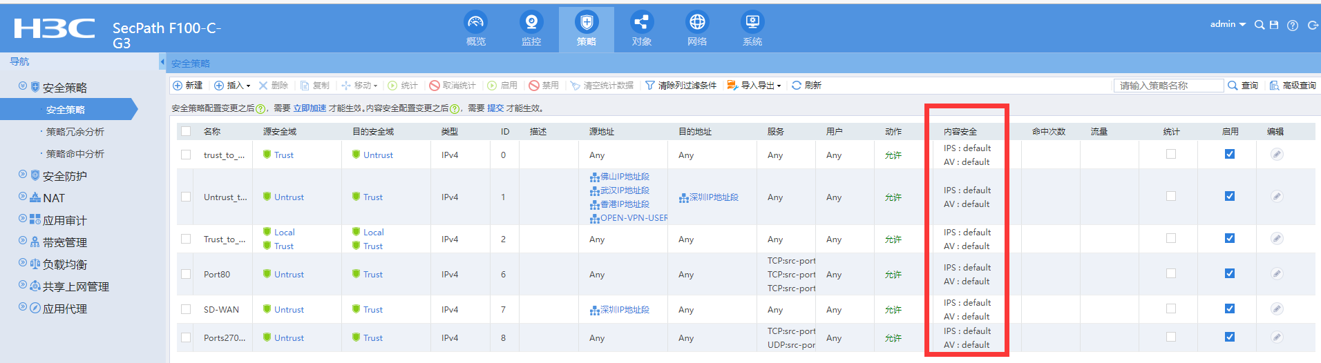 您的意思是这台设备的安全策略并没有生效是吗,等于防火墙没用