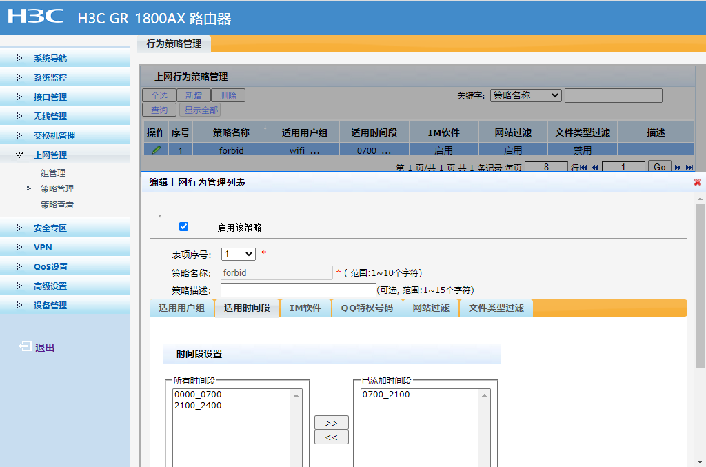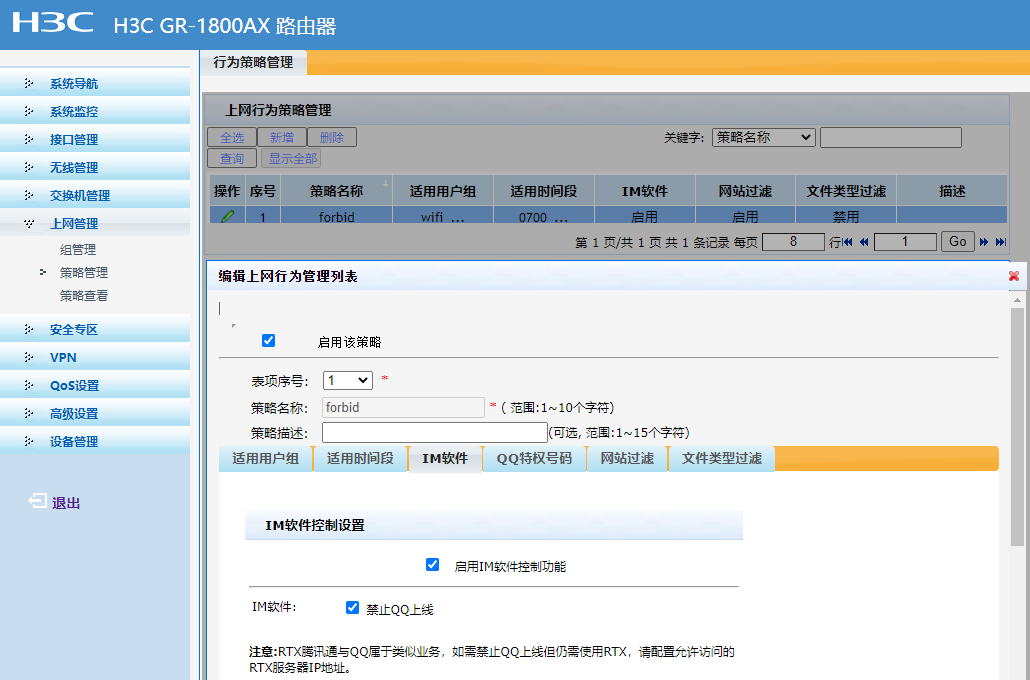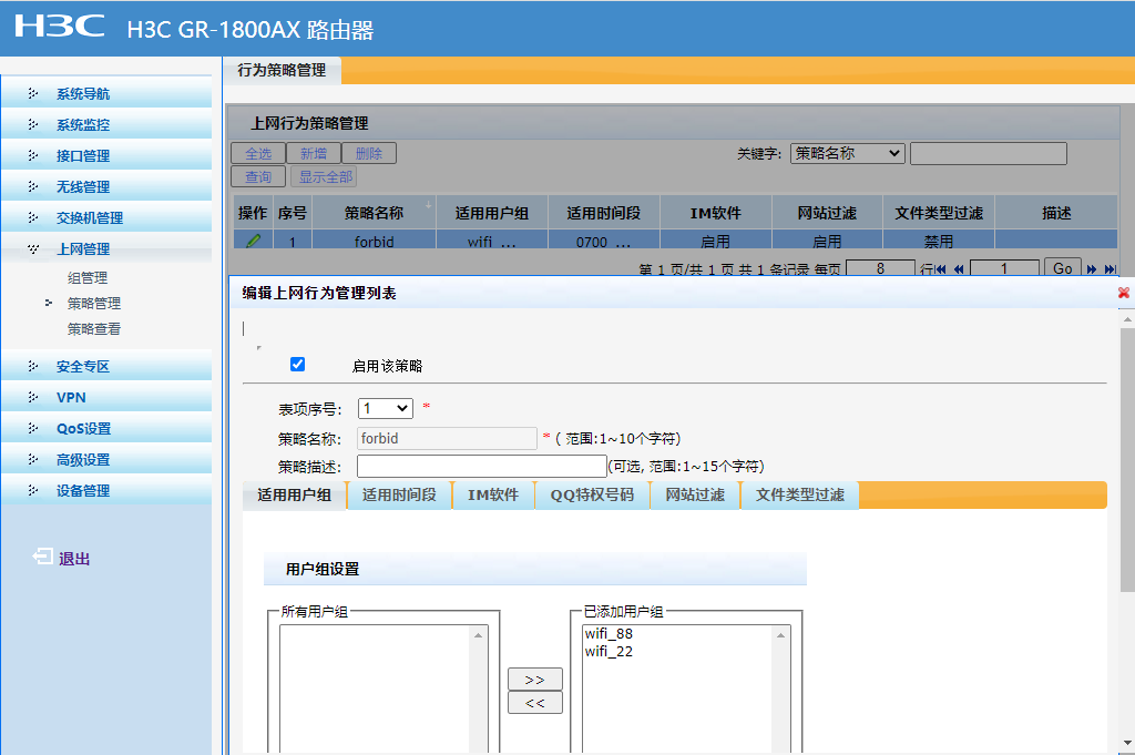 H3C GR-1800AX 路由器web界面策略管理已启用,但对客户端安卓手机仿佛没效果,请问是什么原因呢?见下图