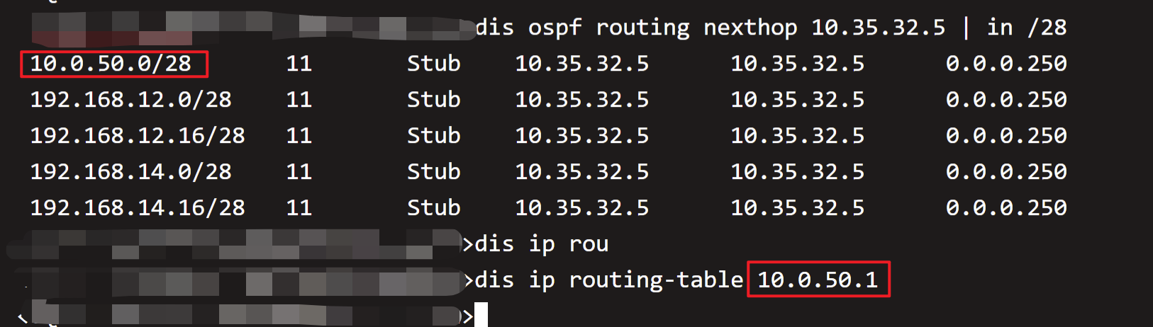 如图,S9850-32H从10.35.32.5的ospf邻居(状态full)学习到28位掩码的路由。但是该路由在全局下却不存在?