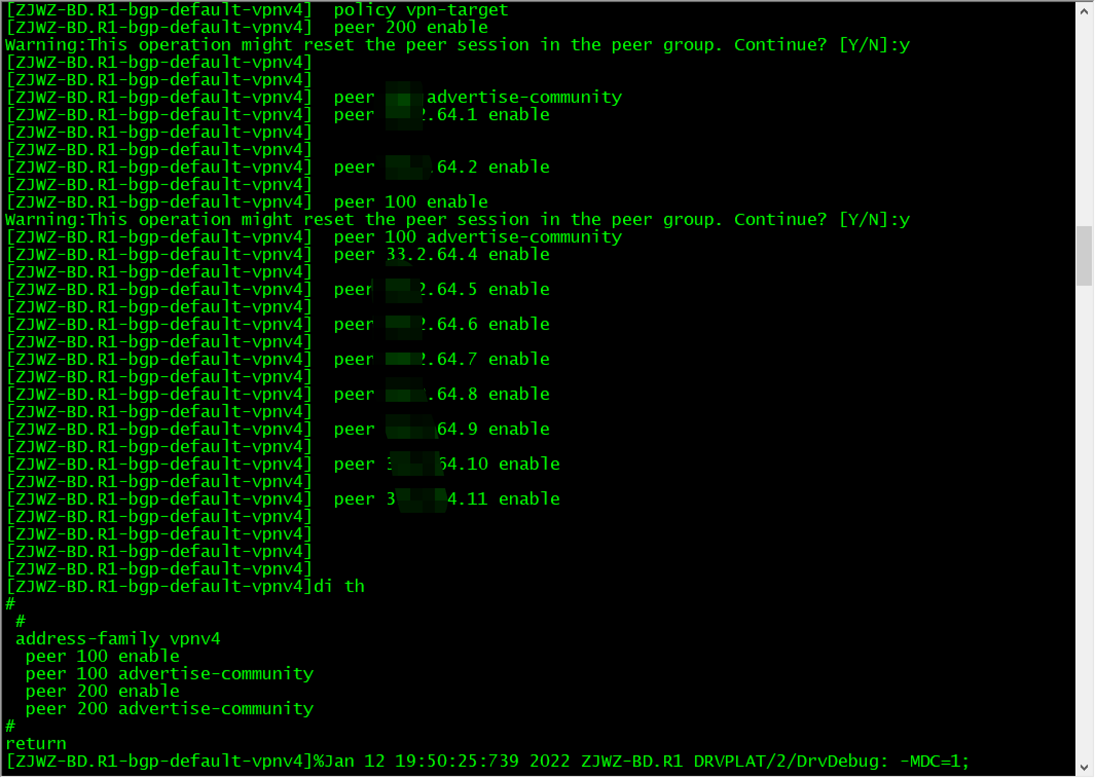 华为路由器ipv4-family vpnv4视图下的命令在华三设备上不生效,华为的ipv4-family vpnv4下的peer,在ipv4-family unicast地址族下宣告过了,请大佬帮忙看看