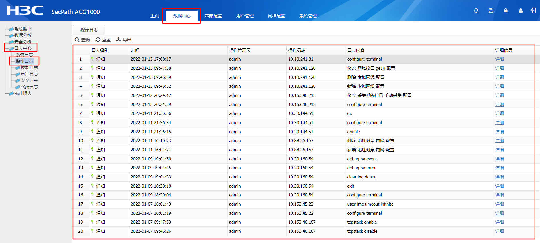 acg上网行为管理能不能查到“操作日志”就是员工登入到设备的操作明细,比如修改了策略等等信息