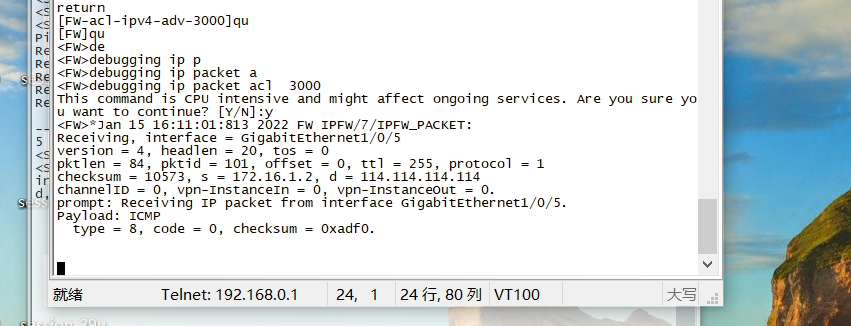 1、防火墙开debug只收到一个正常的icmp报文