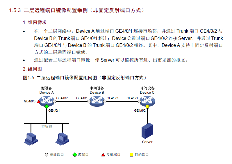 三个部门A、B、C分别使用GigabitEthernet1/0/1~GigabitEthernet1/0/3端口接入Device,现要求通过镜像功能,使数据检测设备ServerA和ServerB都能够对三个部门发送和接收的报文进行镜像。