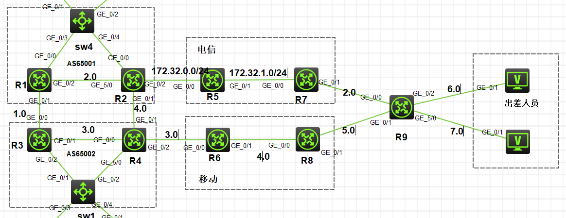 如图所示,想要通过静态路由实现R2优先走电信,R4优先走移动,互为备份,该如何配置